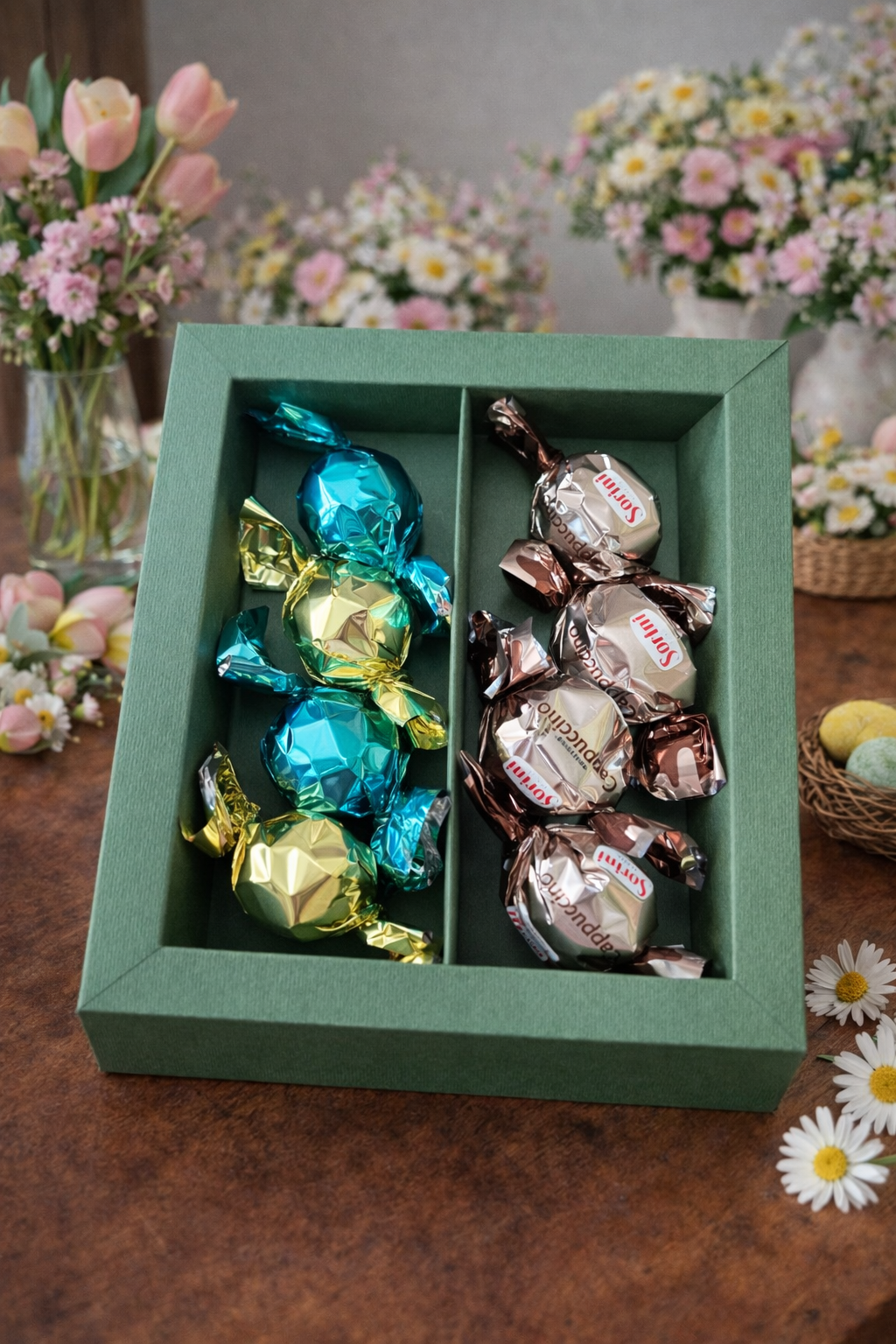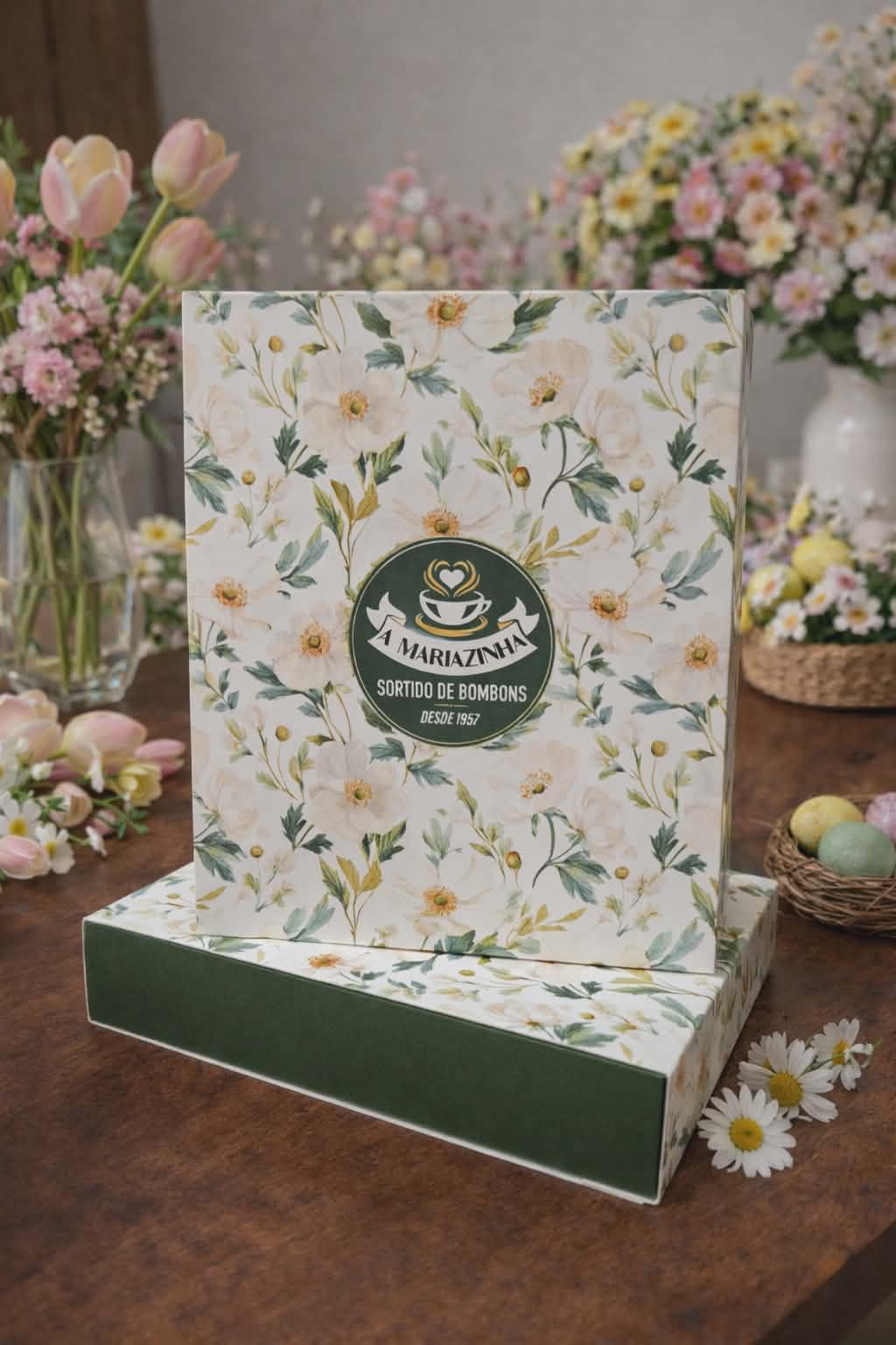 Inspirada na delicadeza da natureza, esta caixa de bombons distingue-se pelo seu padrão floral suave e pelos tons verdes que transmitem frescura, serenidade e harmonia. Um design intemporal, pensado para encantar e oferecer com bom gosto.
