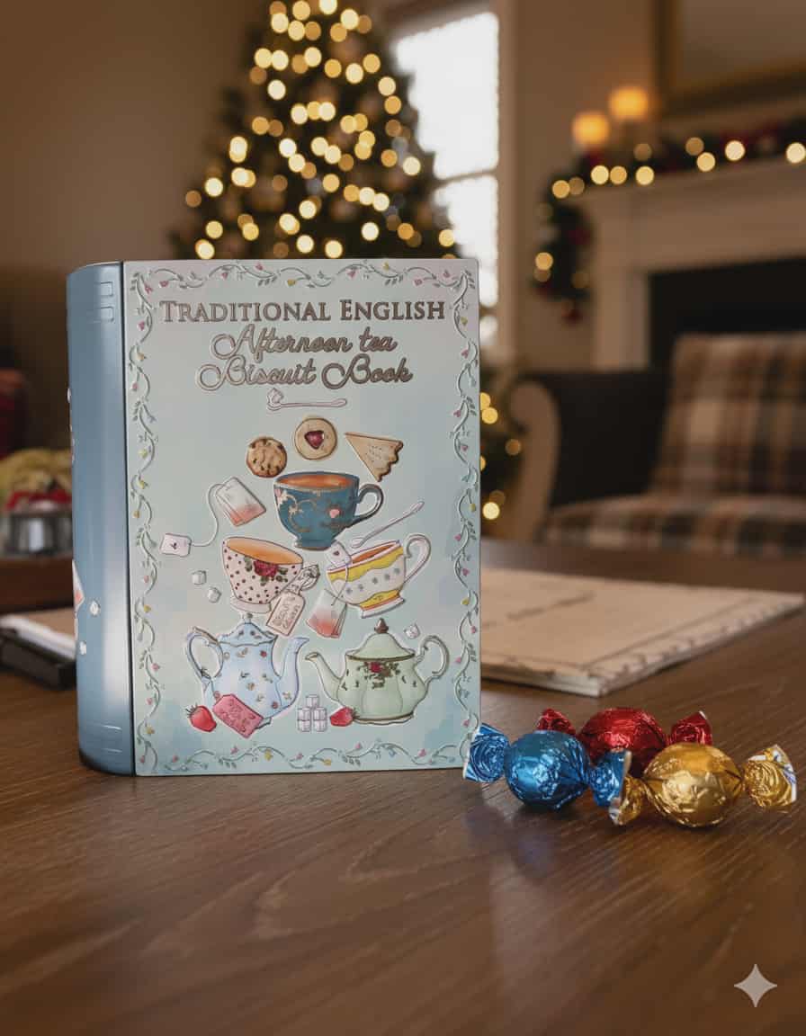 Inspirada no charme dos clássicos momentos de chá da tarde, esta elegante lata em forma de livro apresenta um delicado padrão com chávenas, biscoitos e bolachas. Um design encantador que transmite conforto e tradição. No seu interior, guarda 500g de bombons de chocolate de leite — doces, cremosos e perfeitos para saborear em boa companhia. Um presente requintado que combina o prazer do chá com a doçura do chocolate.