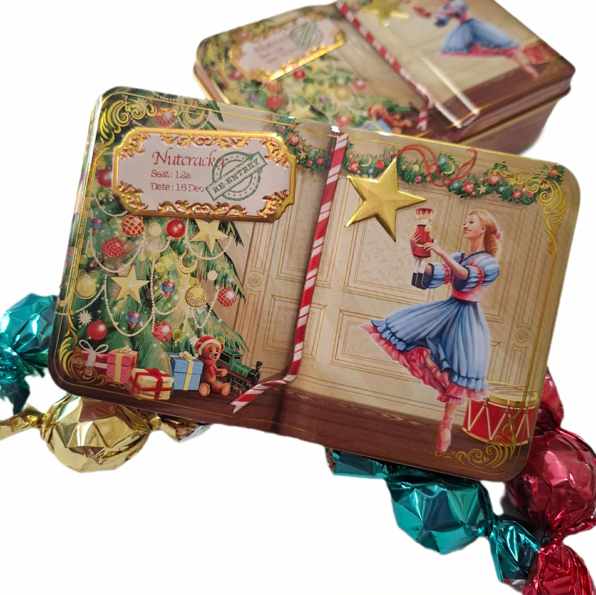 Inspirada no conto intemporal “O Quebra-Nozes”, esta encantadora lata em forma de livro traz consigo toda a magia e elegância do Natal. Com abertura a meio e detalhes delicados, guarda no seu interior 100g de bombons de chocolate de leite — suaves, cremosos e irresistíveis. Um presente perfeito para quem adora a doçura e o encanto das tradições natalícias.