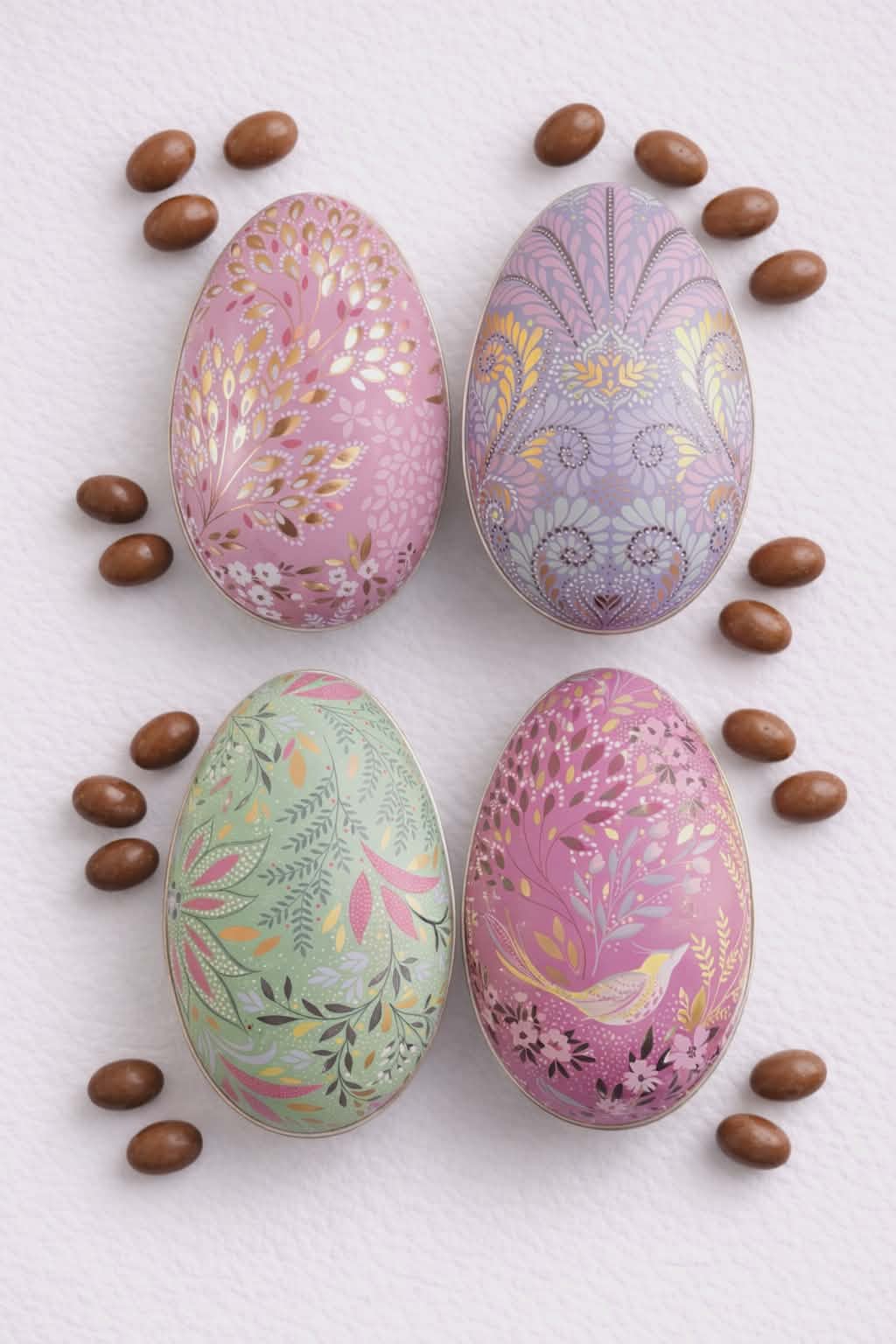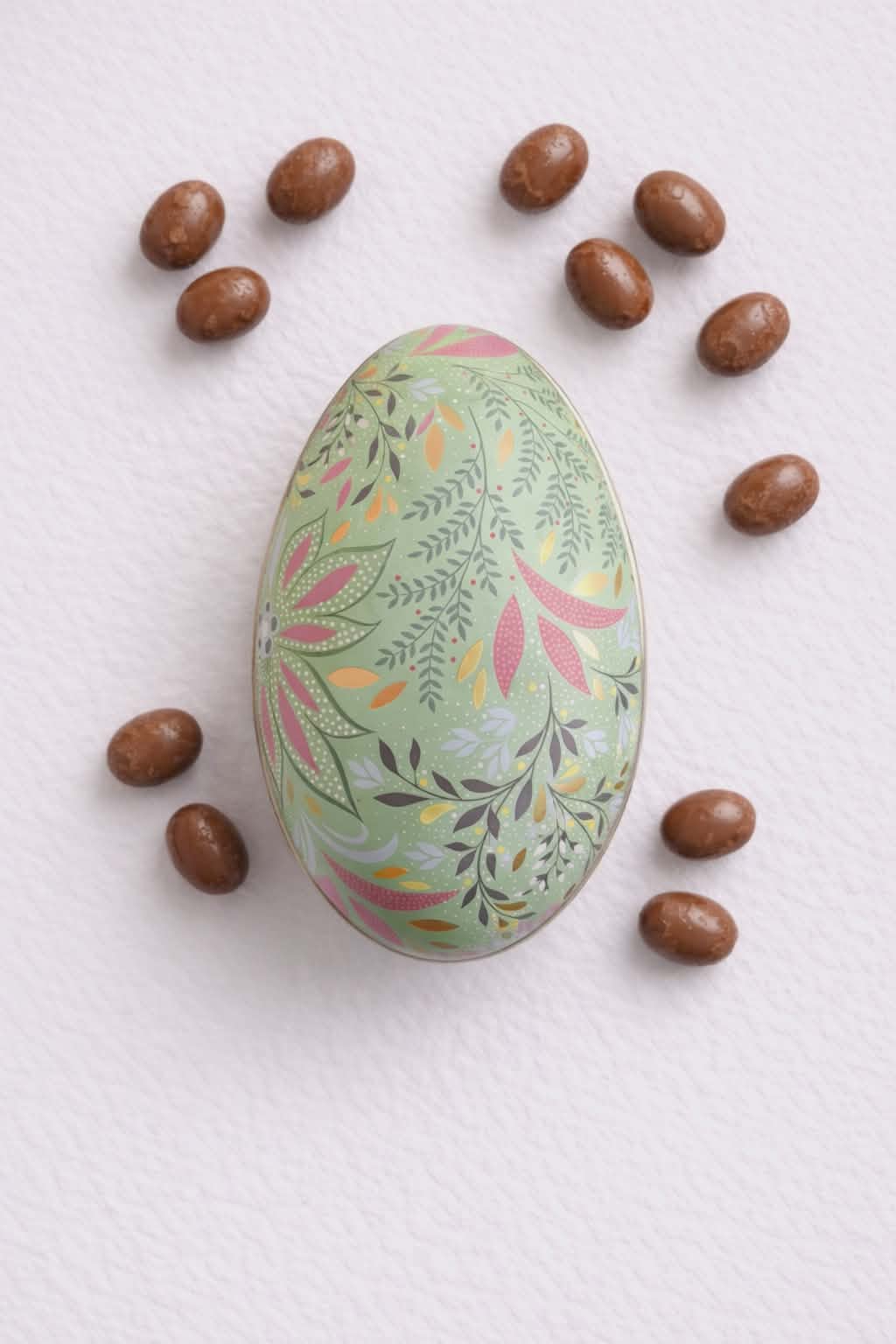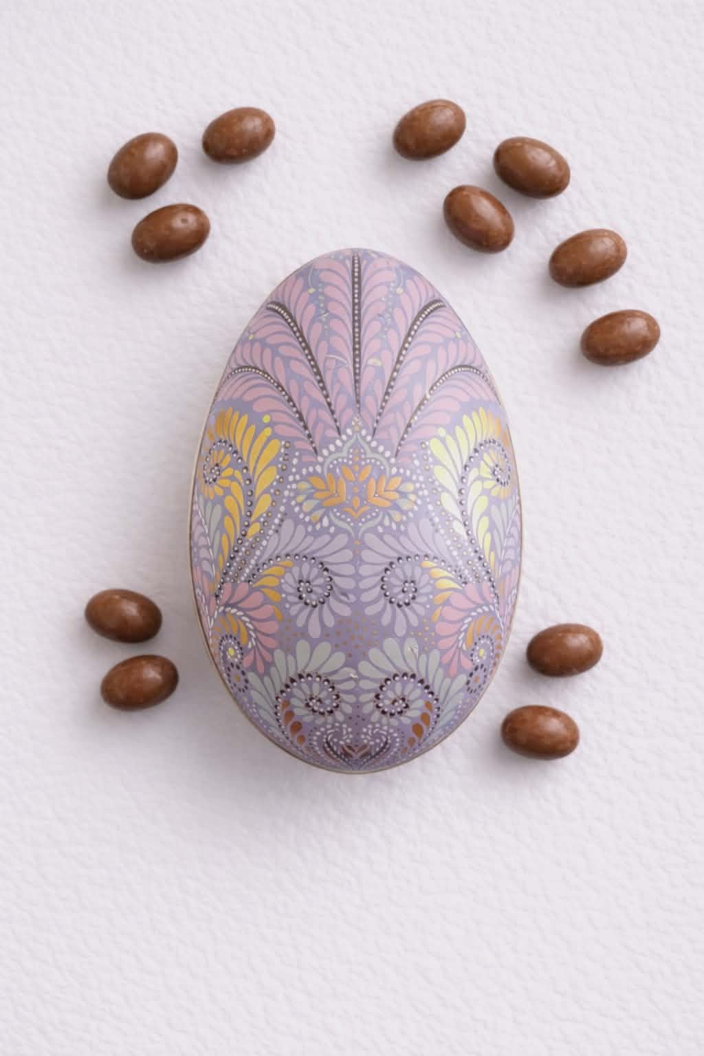 Elegantes ovos metálicos da coleção Sara Miller, conhecidos pelos seus padrões sofisticados e cores delicadas que refletem o estilo distintivo da marca. No seu interior encontram-se 100g de ovinhos de chocolate de leite, cuidadosamente embrulhados em papel prata colorido. Disponível em quatro padrões diferentes, é um presente doce e cheio de elegância para celebrar a Páscoa.
