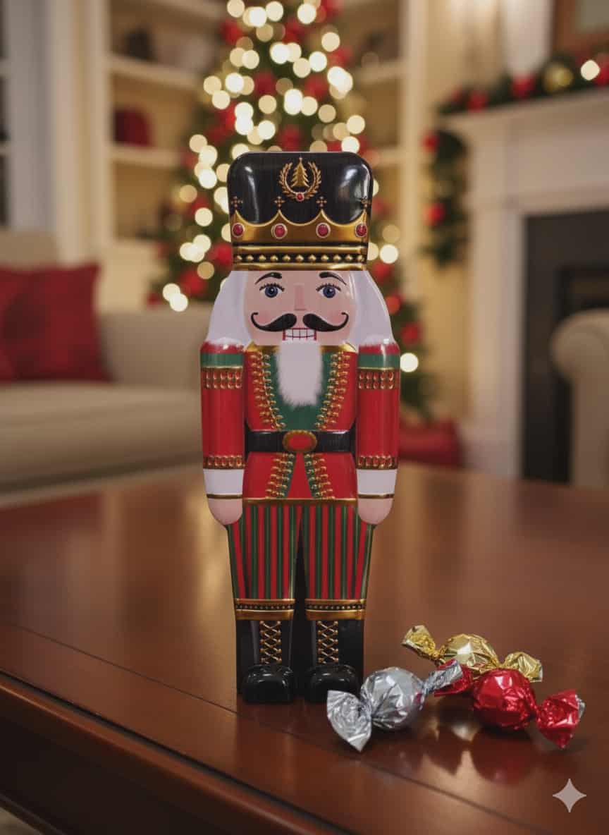 Inspirada no clássico conto de Natal, esta lata “Quebra-Nozes” é uma verdadeira peça de coleção. Com design elegante e cores festivas, celebra a magia, a fantasia e a tradição da quadra. No seu interior, esconde 300g de bombons de chocolate de leite — deliciosamente cremosos e perfeitos para oferecer ou saborear em família.