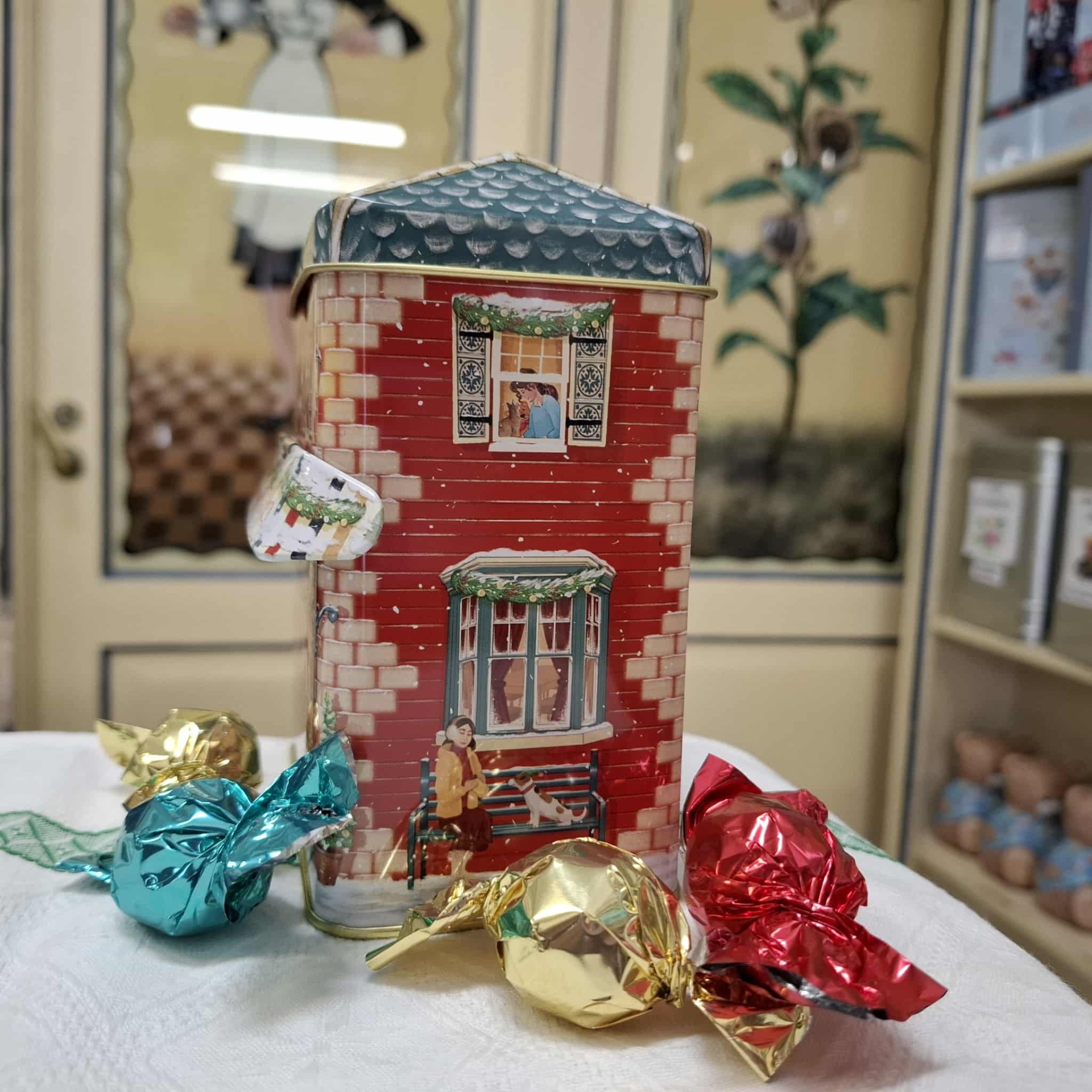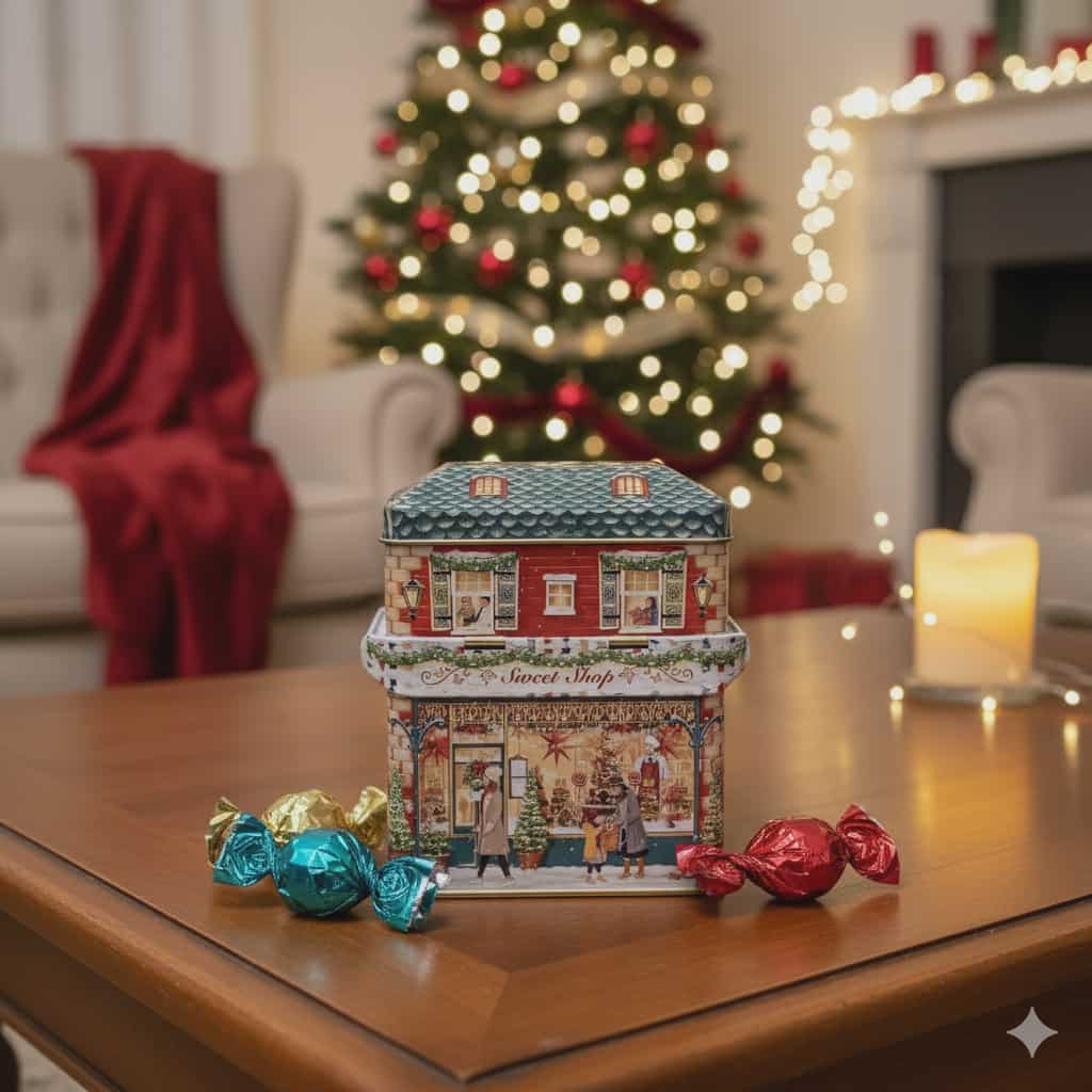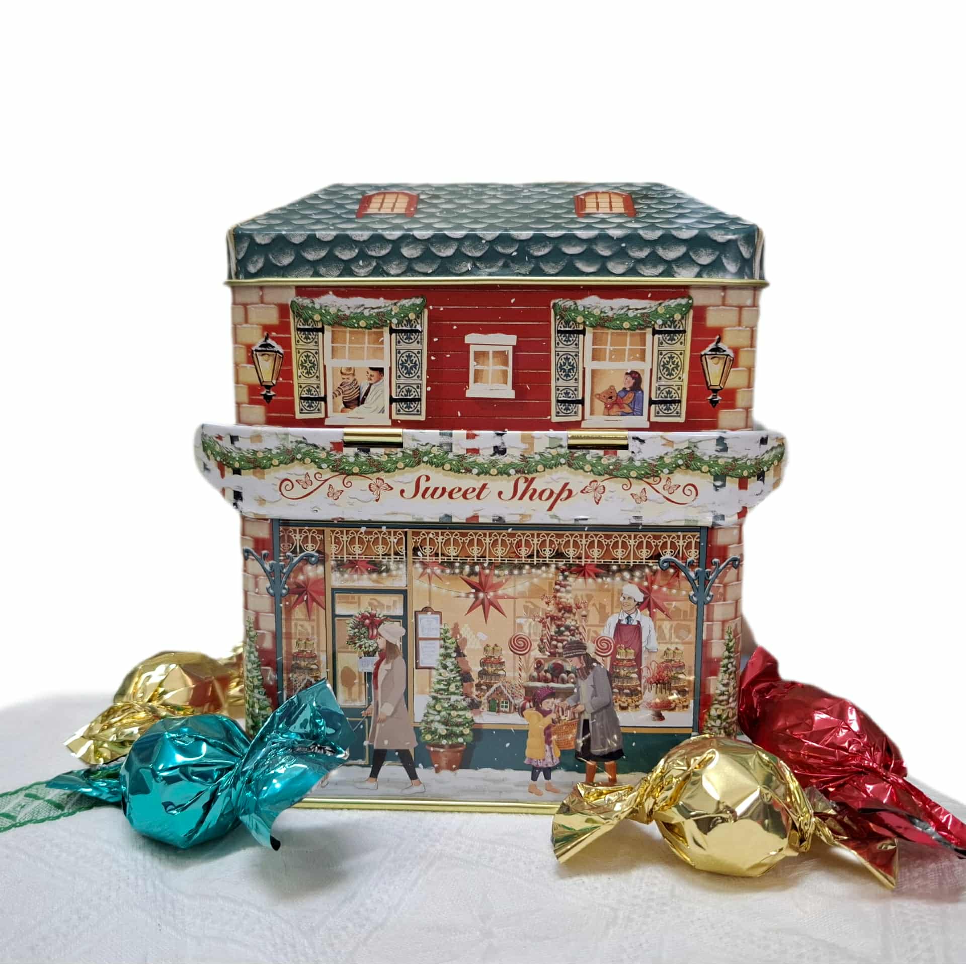 Inspirada no encanto das tradicionais lojas de doces, esta adorável lata é um verdadeiro tesouro natalício. Com tampa articulada em forma de telhado e um delicado toldo frontal, guarda no seu interior 250g de bombons de chocolate de leite — doces, cremosos e envolventes. Uma prenda perfeita para celebrar a magia do Natal com um toque de doçura e tradição.