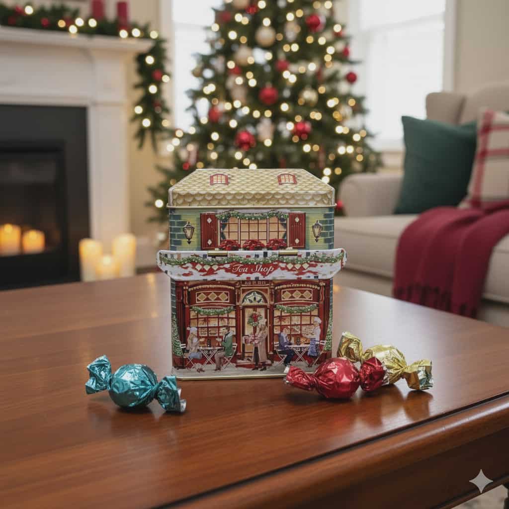 Inspirada no aconchego das tardes de inverno, esta encantadora lata em formato de casa de chá é um verdadeiro tesouro natalício. Com tampa articulada em forma de telhado e um delicado toldo frontal, guarda no seu interior 250g de bombons de chocolate de leite — doces, cremosos e envolventes. Uma prenda perfeita para celebrar a magia do Natal com um toque de doçura e tradição.