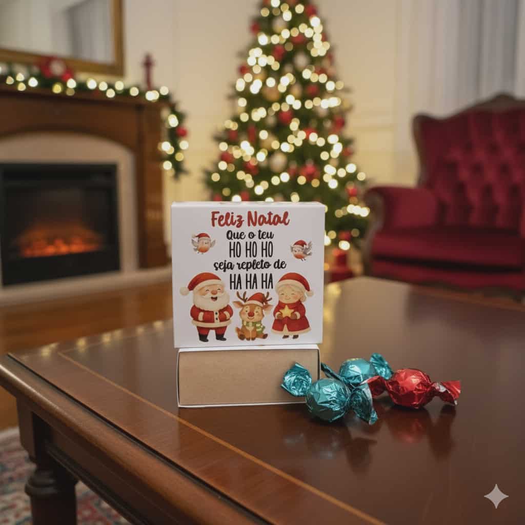 Com a divertida mensagem “Feliz Natal — que o teu HO HO HO seja repleto de HA HA HA”, esta caixa é perfeita para espalhar alegria e boa disposição nesta época festiva. Um presente doce e bem-humorado, ideal para quem vive o Natal com sorrisos e gargalhadas. No seu interior, guarda 80g de bombons de chocolate de leite (6 unidades) — suaves, cremosos e irresistíveis.