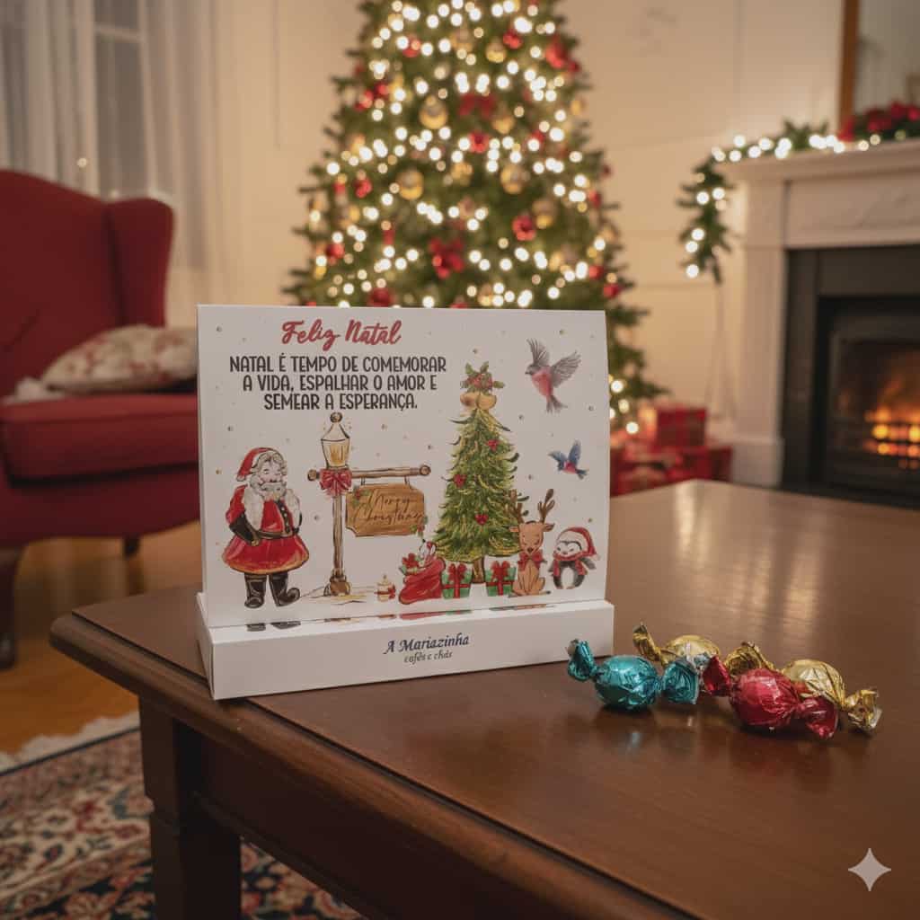 No verso, encontra uma breve história sobre a nossa loja, criada para partilhar a paixão pelos sabores autênticos e pelos momentos que tornam o Natal inesquecível.