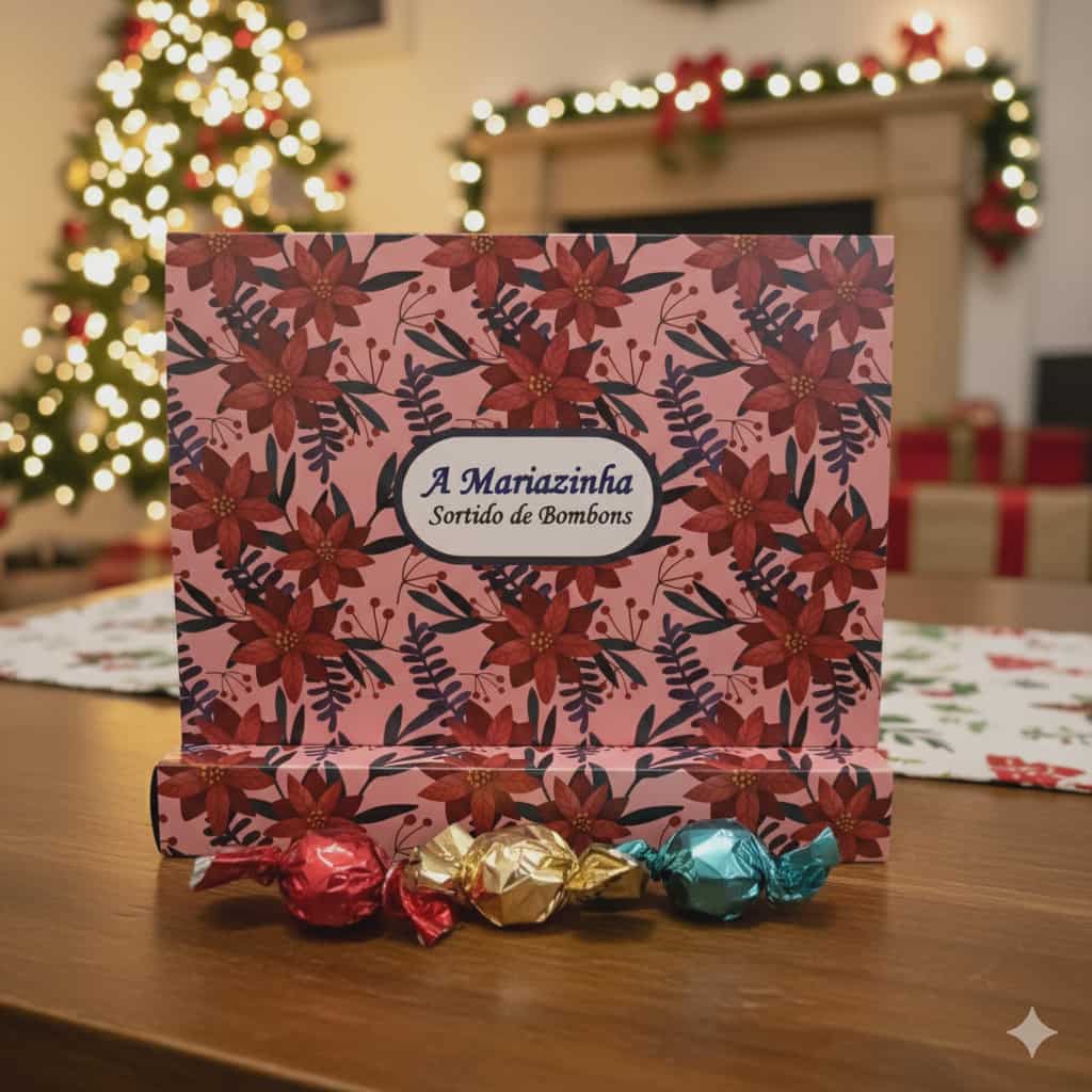 No verso, encontra uma breve história sobre a nossa loja, criada para partilhar a paixão pelos sabores autênticos e pelos momentos que tornam o Natal inesquecível.