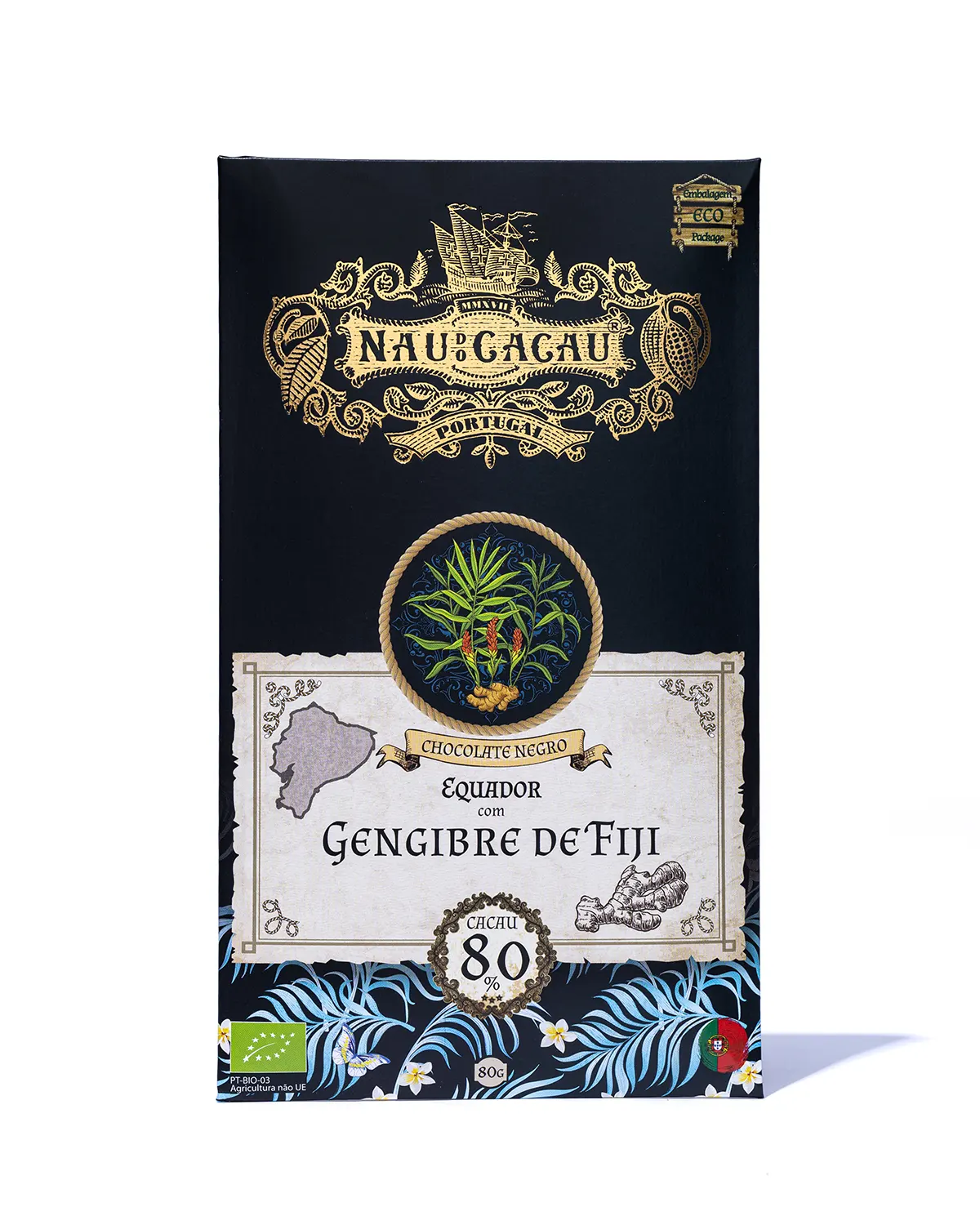 Chocolate artesanal biológico português, produzido com cacau puro de origem do Equador (80%), reconhecido pela sua intensidade e riqueza aromática.